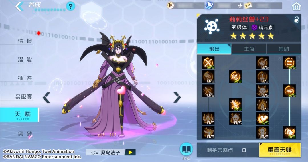 输出天赋:莉莉丝兽的天赋点加成方式,推荐优先加满恃强凌弱和狂热的天赋等级,奥义技强化则是必点天赋之一。同时,根据莉莉丝兽的属性特点,将暴击强化、暴伤强化与致命一击点满。