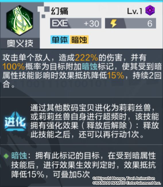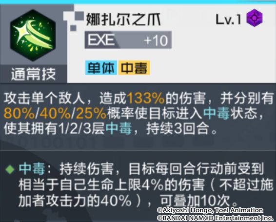技能解析:伤害较高的通常技,有概率造成多层中毒状态;中毒状态属异常状态,适用于搭配弱点核心插件打伤害,或搭配黑暗战斗暴龙兽、钢铁加鲁鲁兽(黑)等对负面状态有额外的数码宝贝,来进一步提升伤害输出。