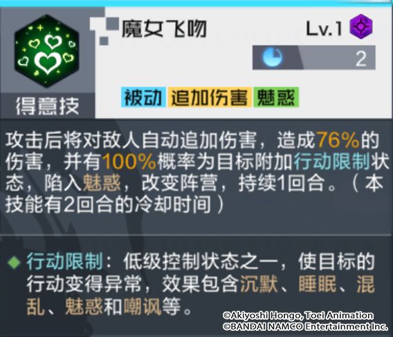 技能解析:攻击后进行的追加攻击,虽然伤害不高,但能稳定魅惑对手,造成控制,同时配合被动技能极高概率得到其15%的攻击增益。