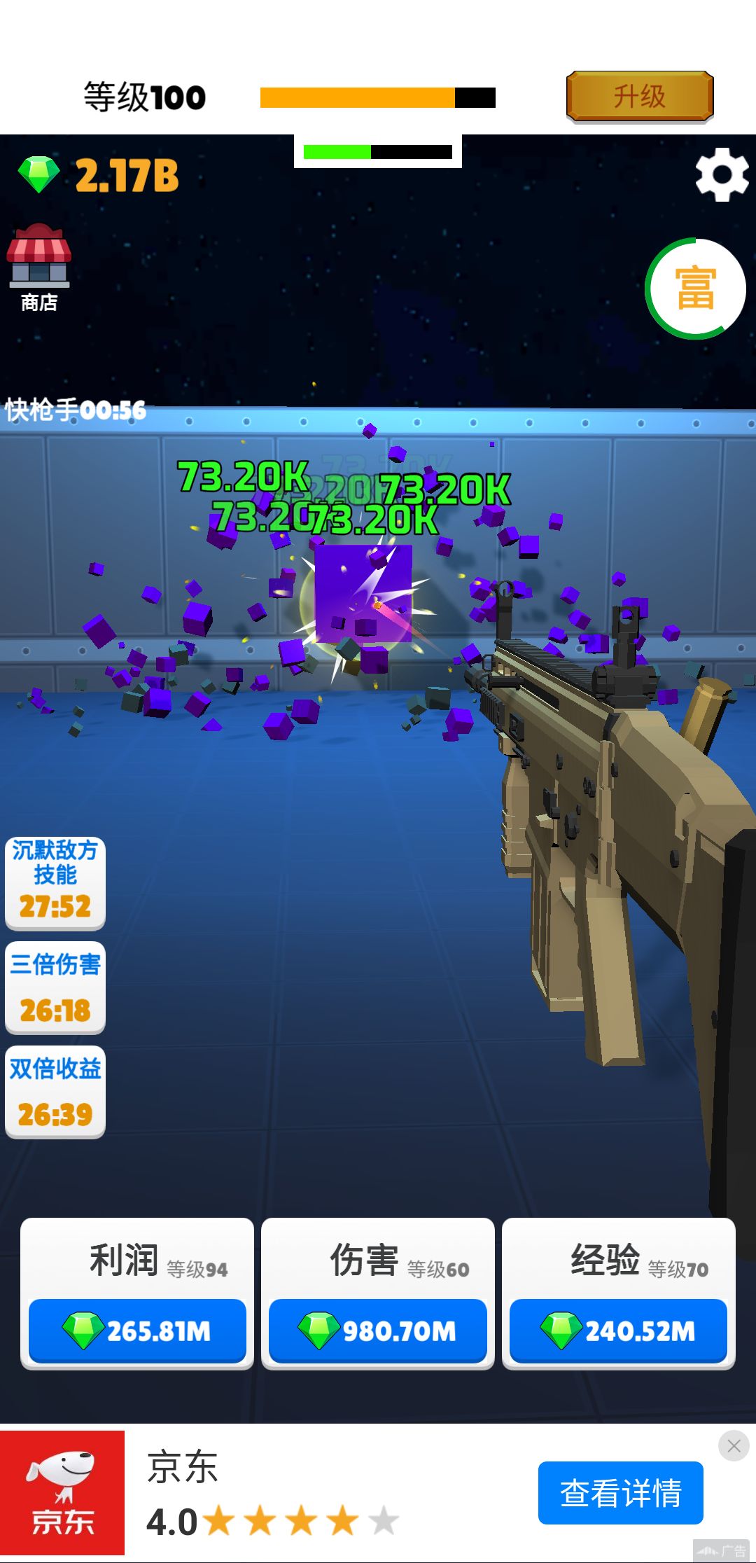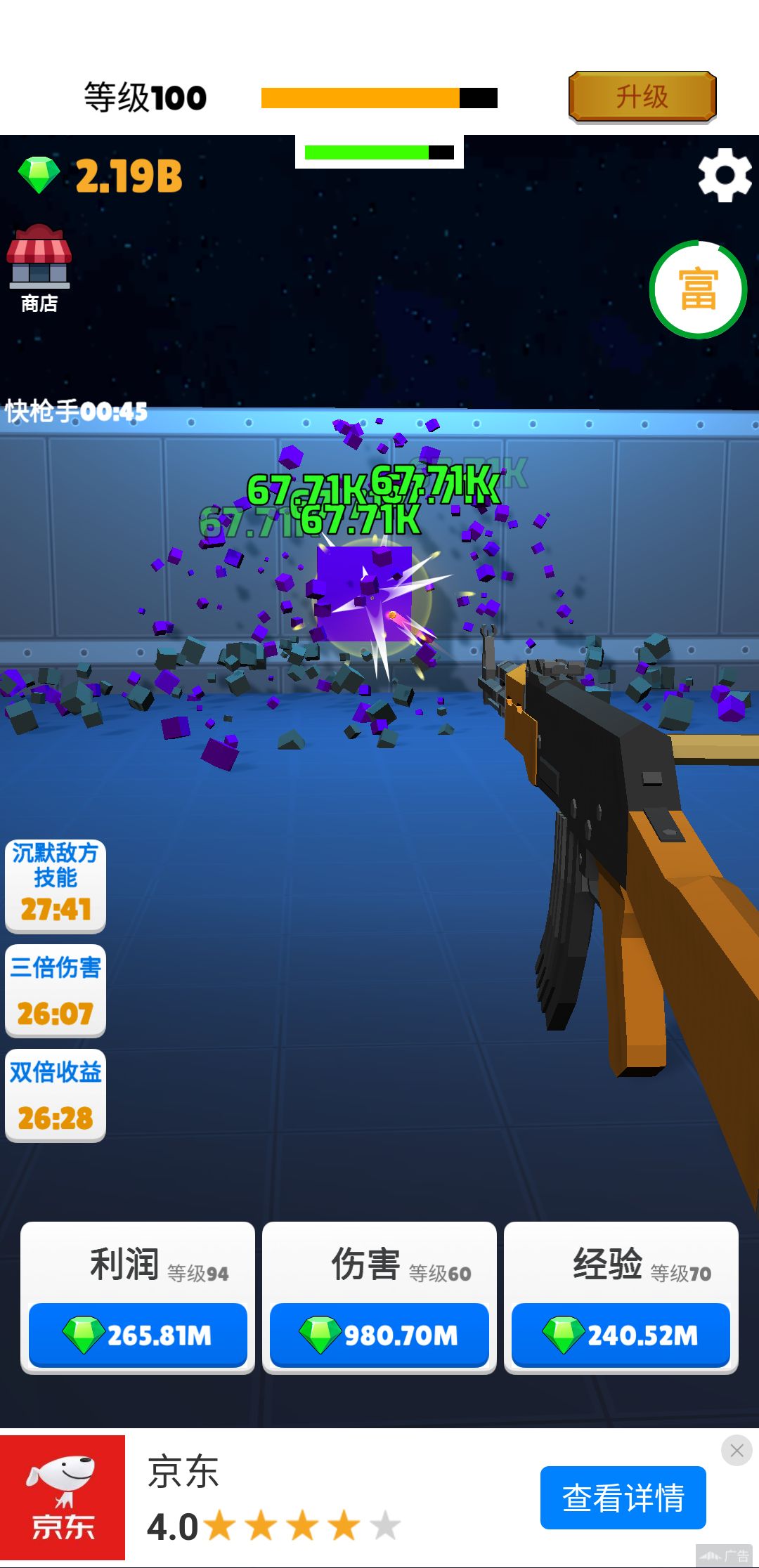 40级后通过快枪手不断看广告增强攻击力。钻石优先加利润>伤害>经验。利润等级越高,大富豪收益越大。离线收益也多。