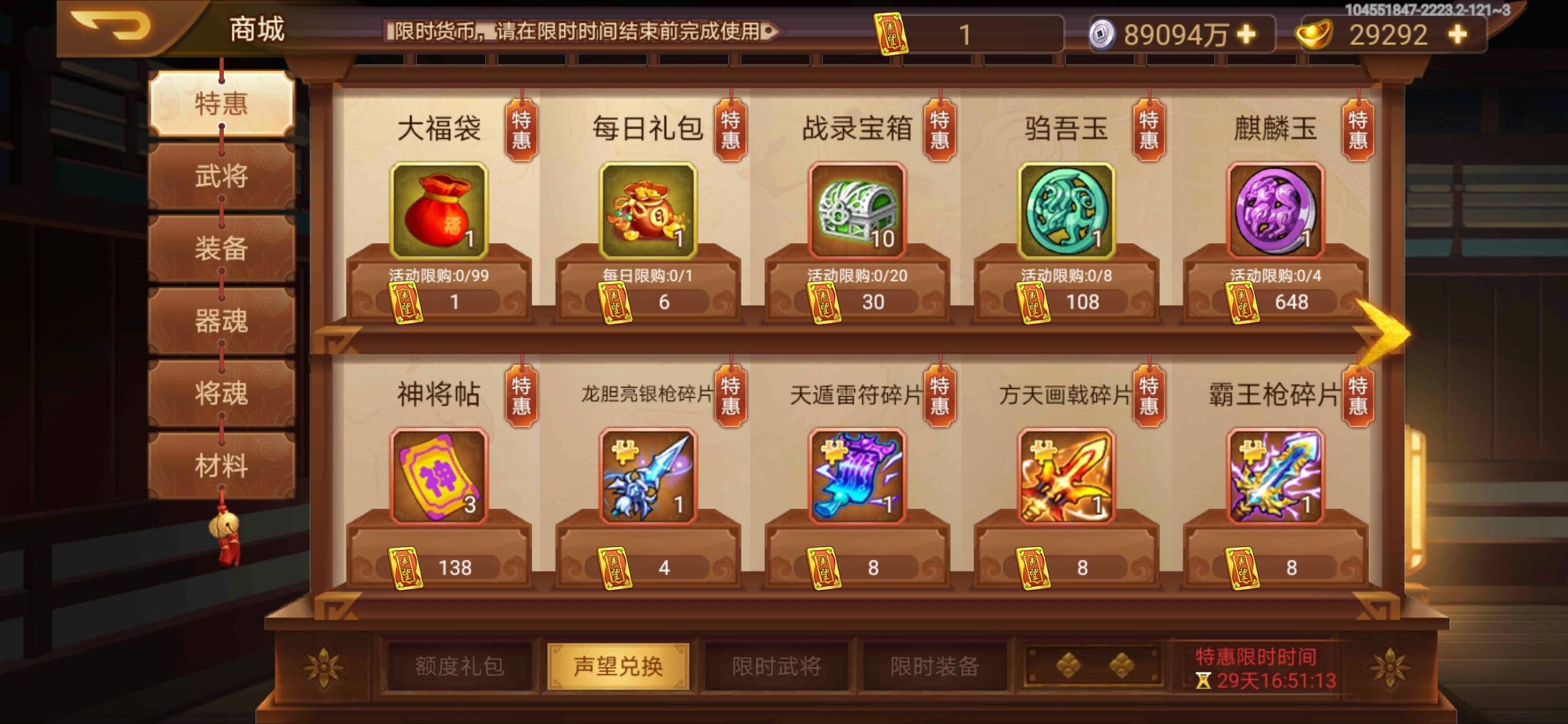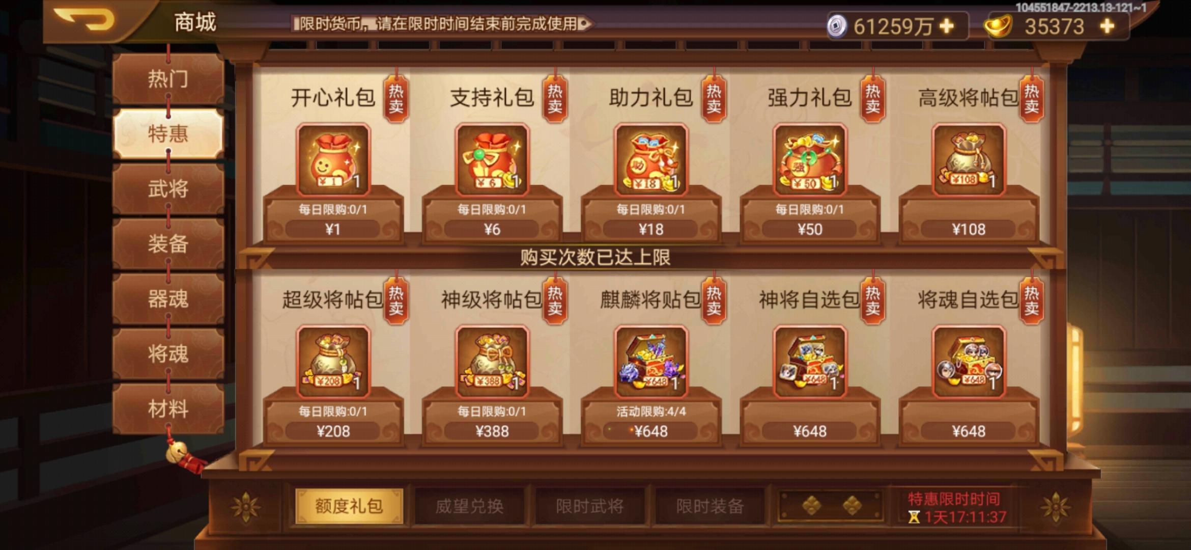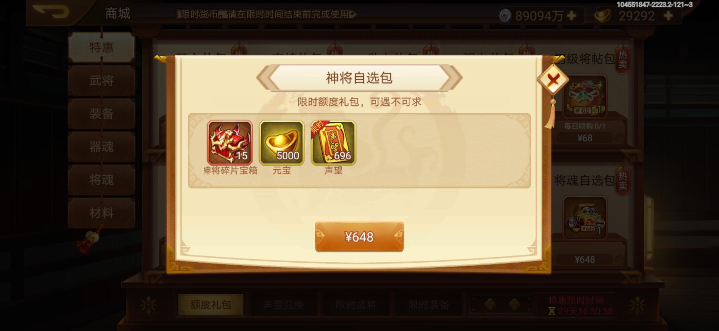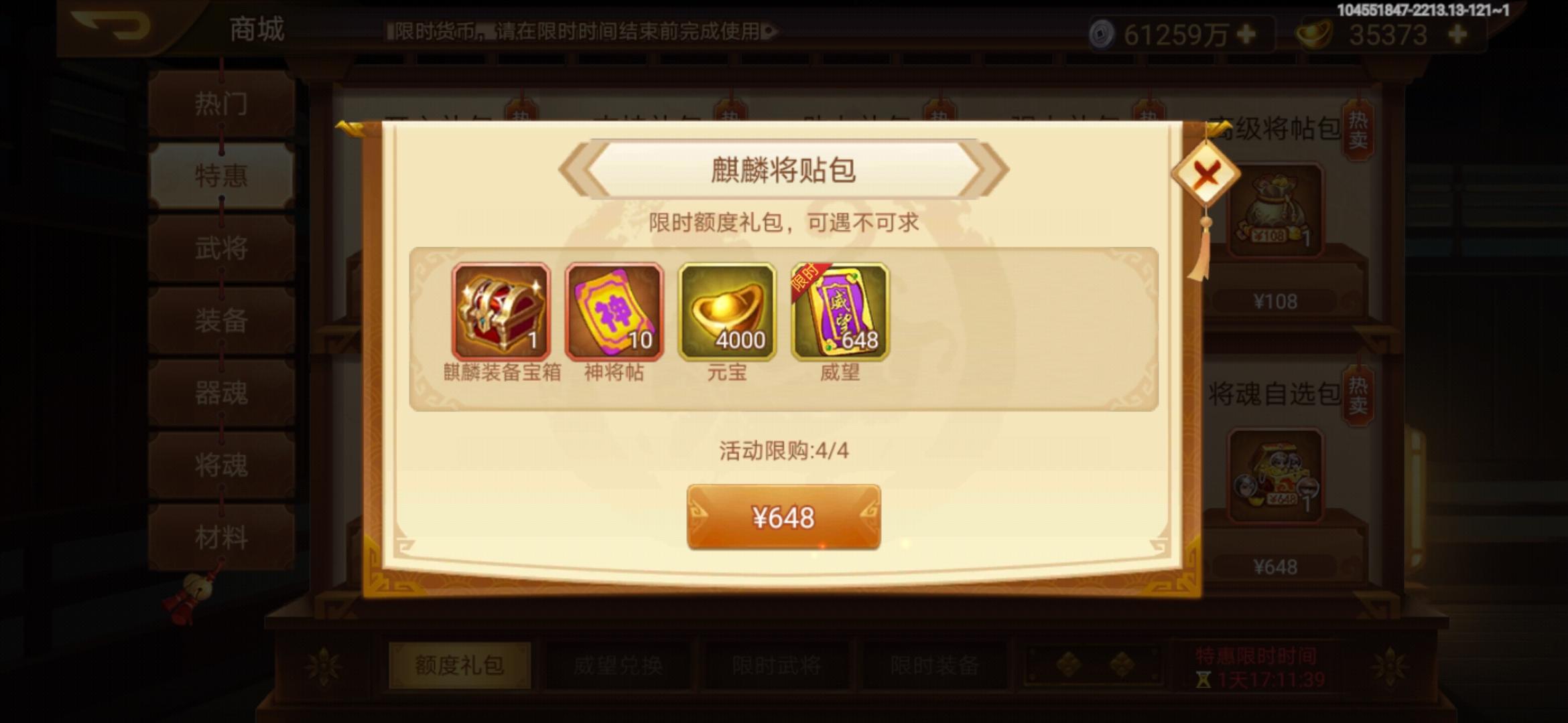 以前的麒麟礼包和现在的麒麟玉对比,以前礼包内容1个麒麟装备,10个神将贴,4000元宝,648威望,现在的麒麟玉要648声望才能换当前版本只剩2个648礼包了,神将礼包和将魂礼包不管是哪个礼包想要麒麟装备的话就要花648声望换玉不能换别的材料了