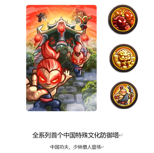 与神龙英雄同时登台的,还有全系列首个中国特殊文化为基础设计的防御塔,包括中国功夫、少林僧人等都将亮相《王国保卫战4》,而中国神话中上古传说的那些怪物,比如恶龙年兽、舞狮小鬼等都将悉数登场,为玩家们的保卫工作提出新的要求和考验。