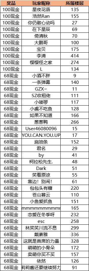 恭喜以上幸运车手中奖!~车手们可以在【个人中心—回复栏】查看自己的楼层数,另外西理会将奖励领取的方式回复在中奖楼层之中哦!(7个工作日内没有联系工作人员视为放弃奖励)