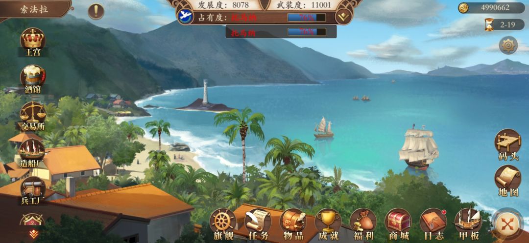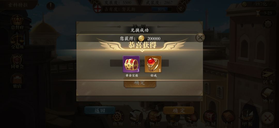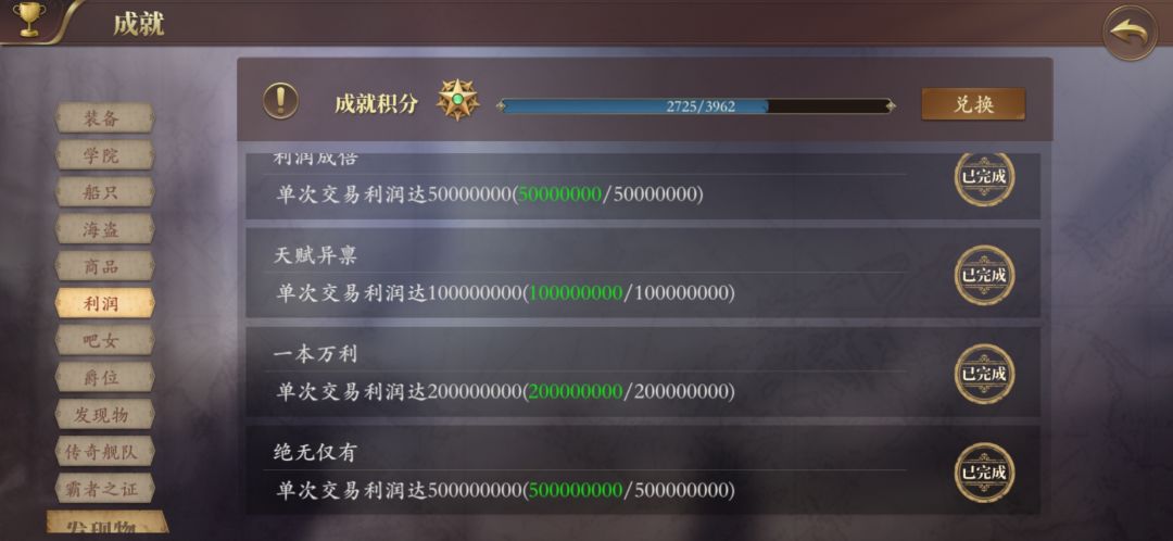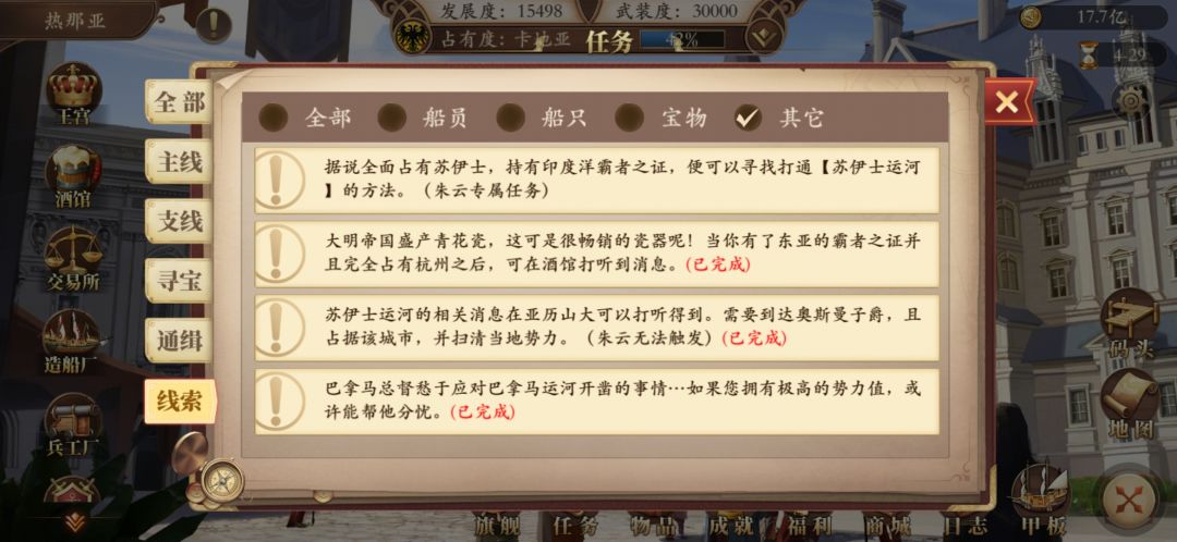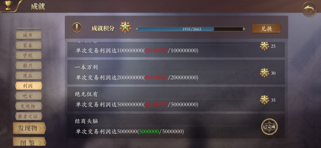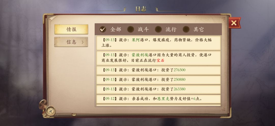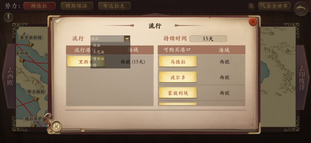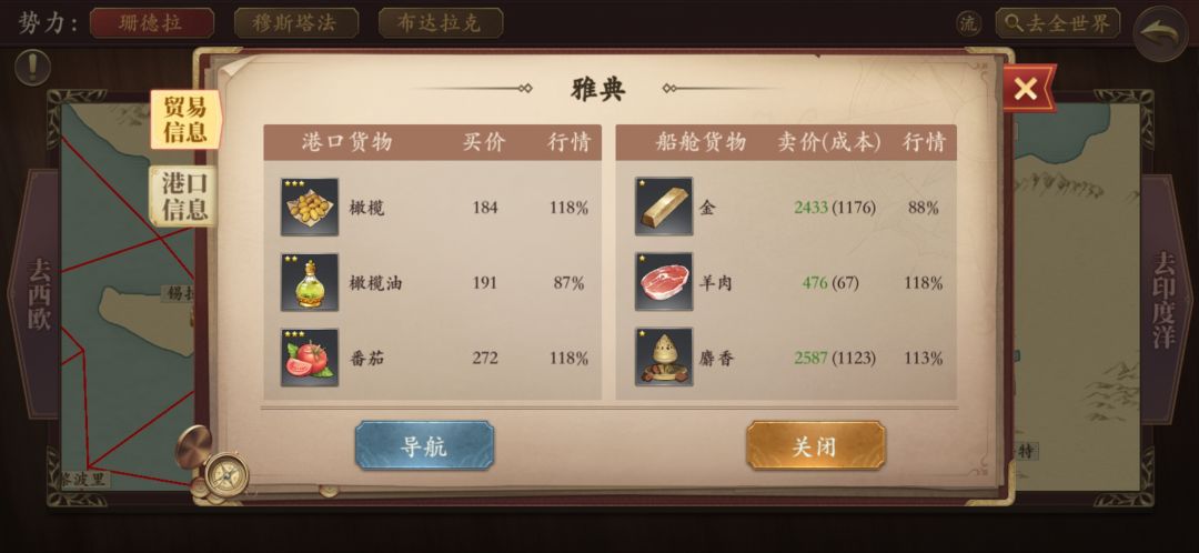 投资各个港口武装度和发展度【如果你的成就里有势力值成就】,各个港口都要投资发展度,帮npc开启全部商品,这样才能更好的把商品刷5星,npc买到的物品种类多了,赚的钱多了,给你的钱自然也就多了