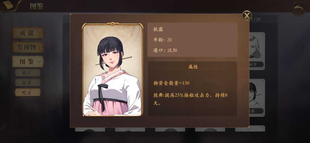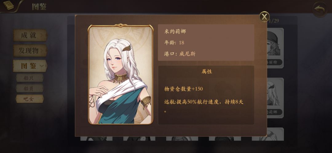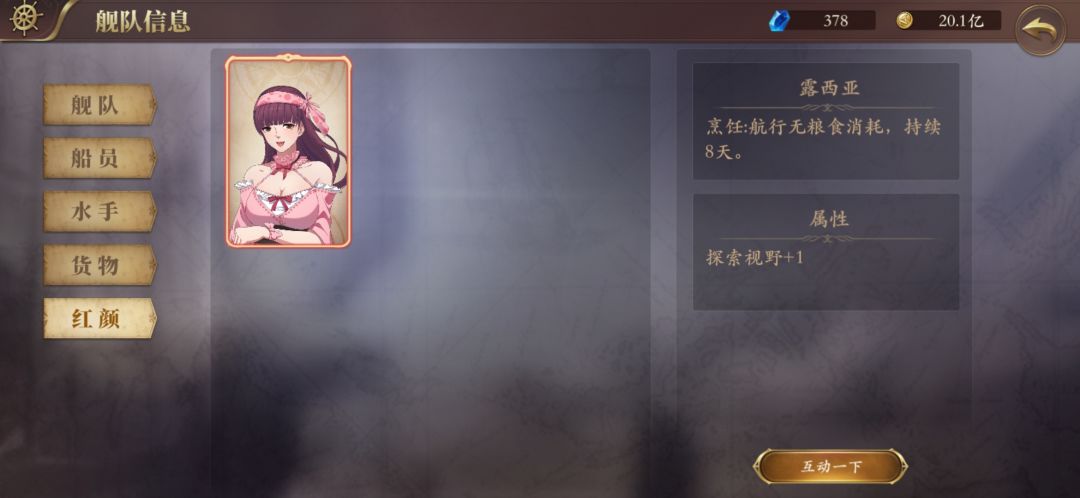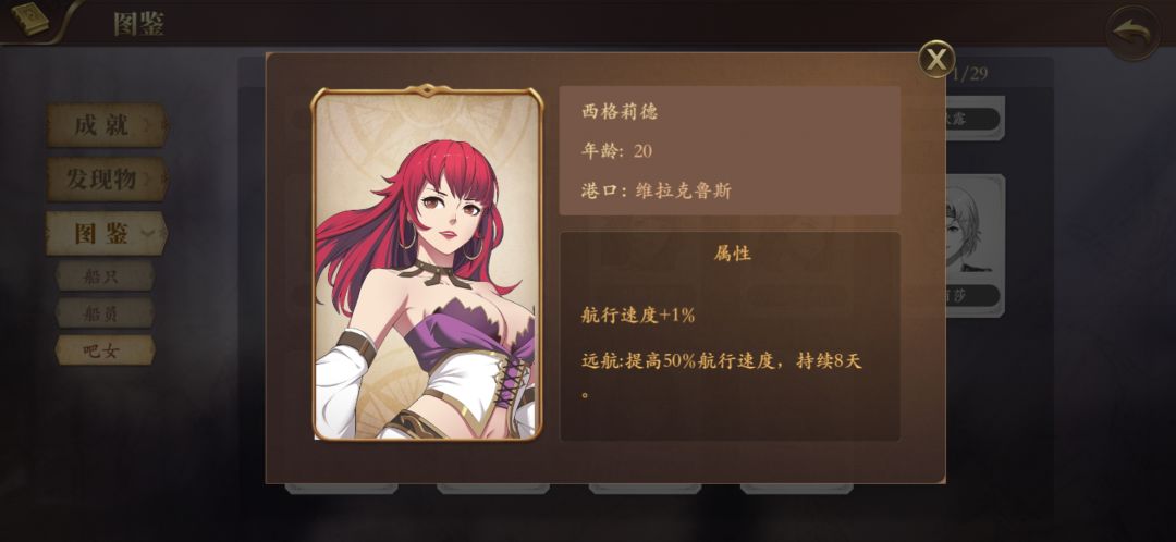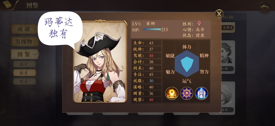 可以在这里查看她的两个技能【被动技能可以叠加】,也可以送礼物【航海途中偶遇漂流宝箱,开寻宝任务宝箱,打野怪,打各个国家队都可以获得礼物】,好感值满,就需要戒指一枚【打国家队,黄金宝箱可能获得戒指】,邀请她上船【戒指掉率取决于你玩的难度】【戒指掉率真的很低很低】