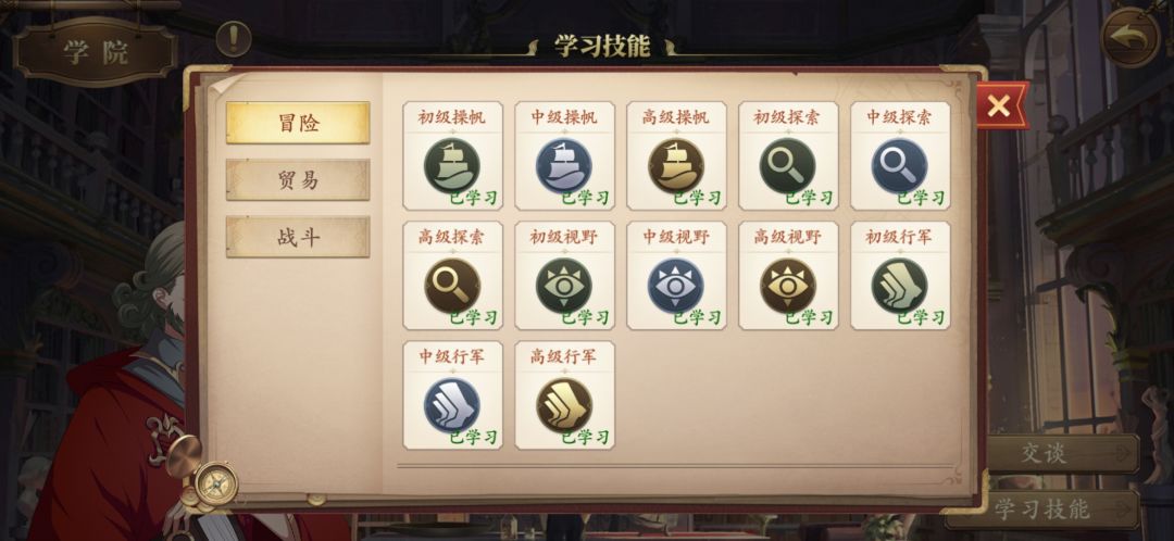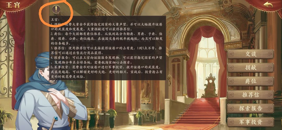 ▶王宫【游戏中各地区的称呼不同,也可以称为总督府/衙门/官府】【小港口不具备主港口这么齐全的功能,小港口只有交谈,推荐信,军事投资】