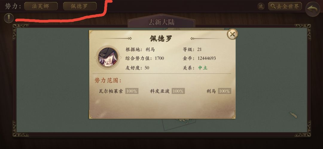 这张图里的①就代表有线索,线索的获得取决于你的是否达标,标准分为等级,占有度,爵位等等