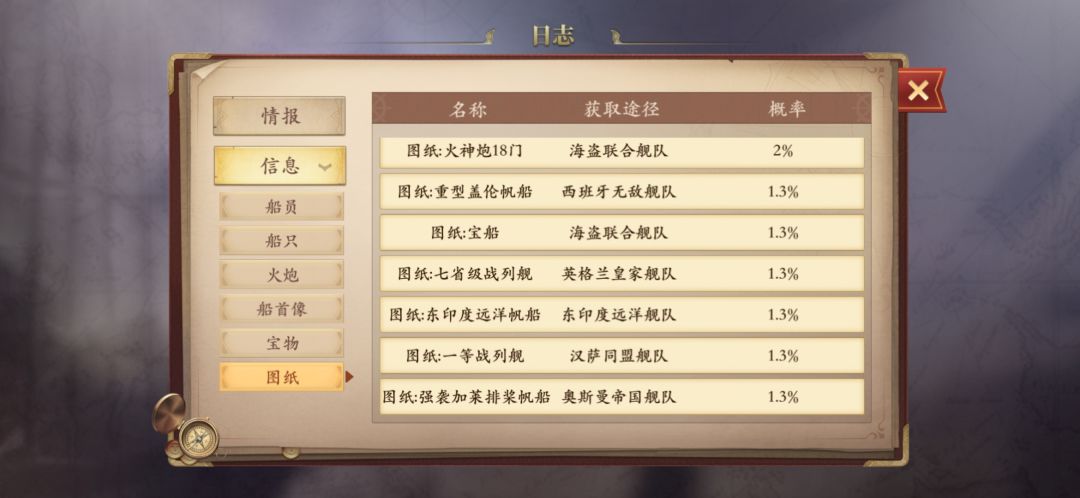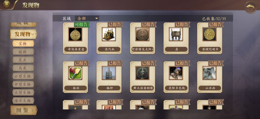 探索报告:只有正经的国家附属主港口才会有探索报告一项【海盗主港口加勒比海拿骚就没有这项】,探索报告提交的是,你在航行途中遇到的各种生物,海洋生物和陆地生物,当你遇到海洋生物的时候,你的屏幕上会看到海洋鱼类的图案,你点击一下就记录了这种生物,陆地生物是你在海岸线【也就是贴着海边走】会看到屏幕出现一个🔍的图案,同样需要你点击记录
