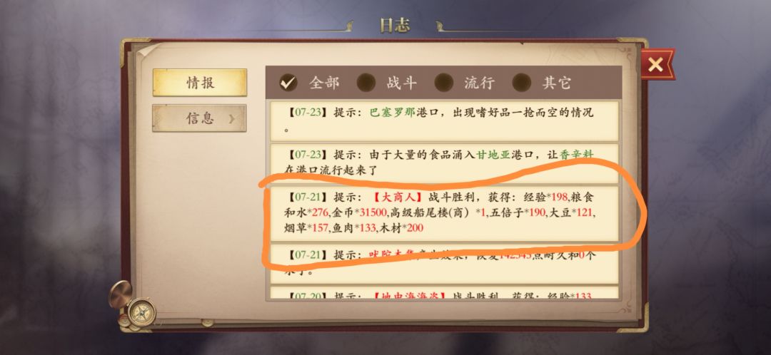 绿色圈:点击流字可以查看世界流行,流行港口,流行货物是什么,流行的天数,以及在那些港口可以买到该港口流行缺乏的货物