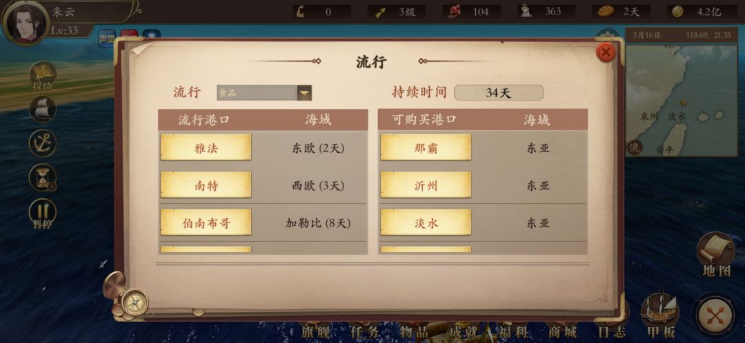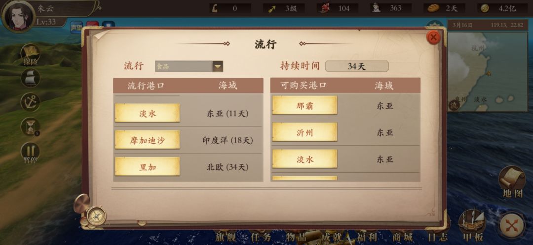 如果你的疲劳值不为0,那么可以点击码头,点击出港补给,点击出港,然后不要动飞速进入港口,反复操作,直至你的疲劳值为0,然后自动导航,吧女技能,飞速回出货港口,因为时间的推移,港口的流行市场行情会下降【我的就是从192%落到186%,主要是我往返用了差不多58天】,然后一口气卖出就ok了