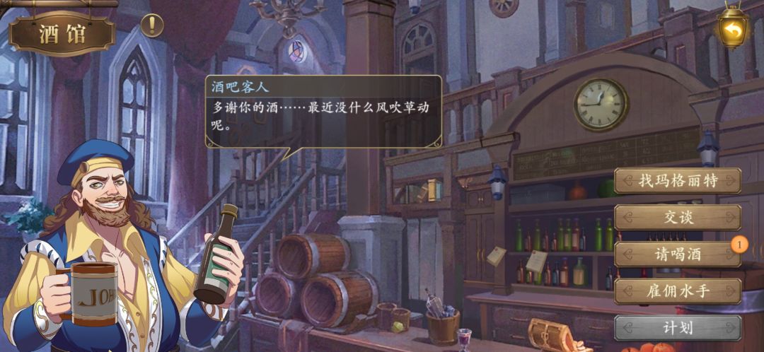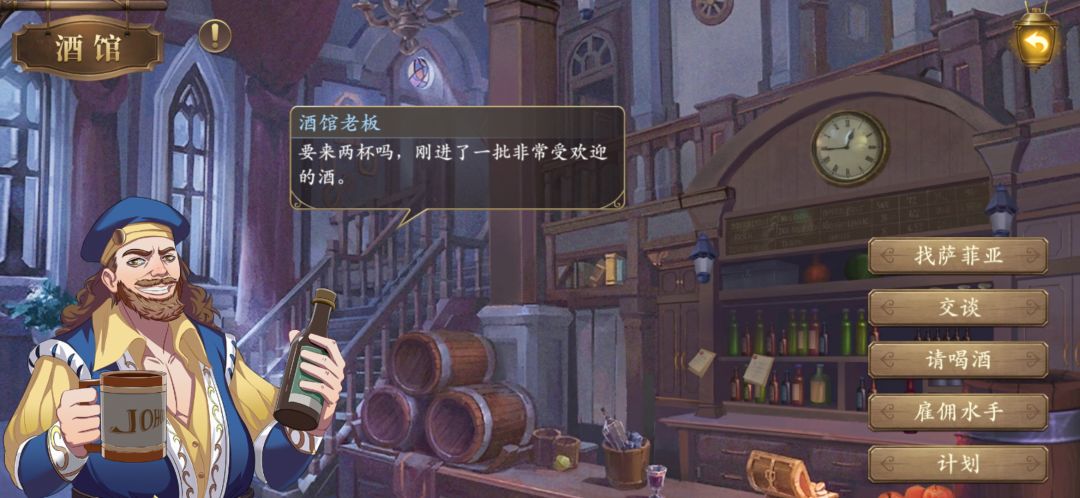 请喝酒:获得该区域npc势力的舰队信息【具有概率性】,降低10点疲劳值,触发任务,获得宝物、船只、船员等消息的线索【请一次5000金币】