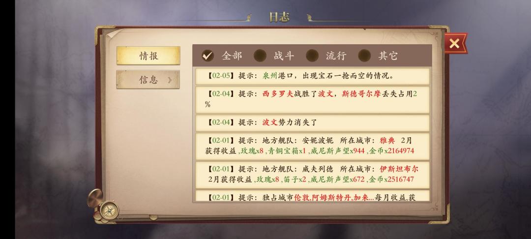 解释一下:威压后的区域,经过他们的战斗你和战斗双方npc有重叠占有度的港口,占有度会减少【举个例子:威尼斯港口,你占50%,李四占50%,张三和李四打架,随机到了威尼斯港口,出了饥荒食品流行,威尼斯港口你掉了2%占有度】,这是一件好事,因为被你威压后的npc把空出的2%再次占领,因为已经被你威压,他再次占有你也不会亏,你该能买到多少商品还是能够买到多少,npc能够买的货物量越多,越好帮你刷商品⭐级