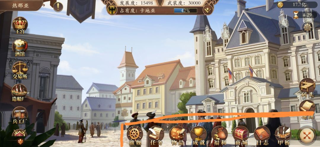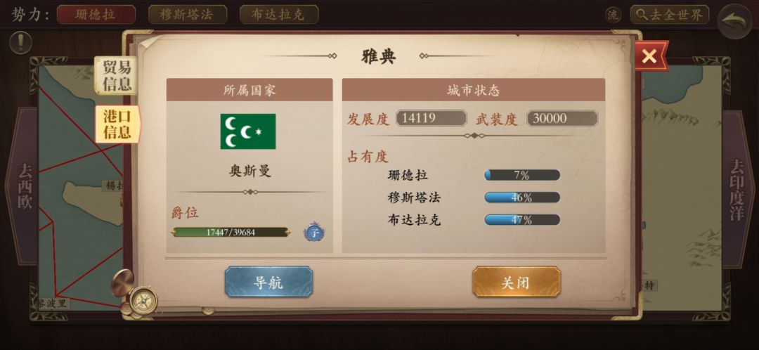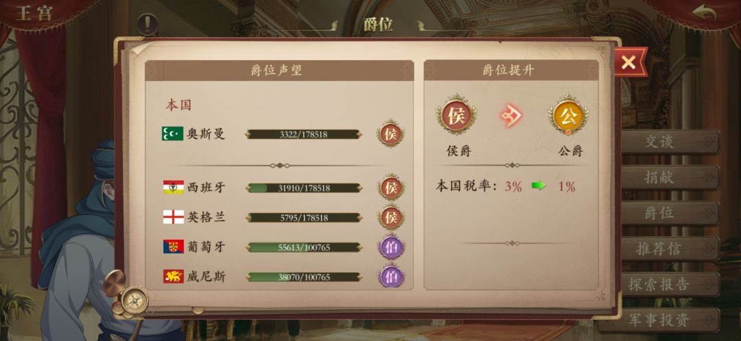 爵位:用于降低交易所税率,很多任务都需要你达到什么爵位才能开启【非国家附属的港口是没有爵位的,也就是说税率永远都是10%,这种港口就是自由港口,例如东亚的自由主港口大阪】