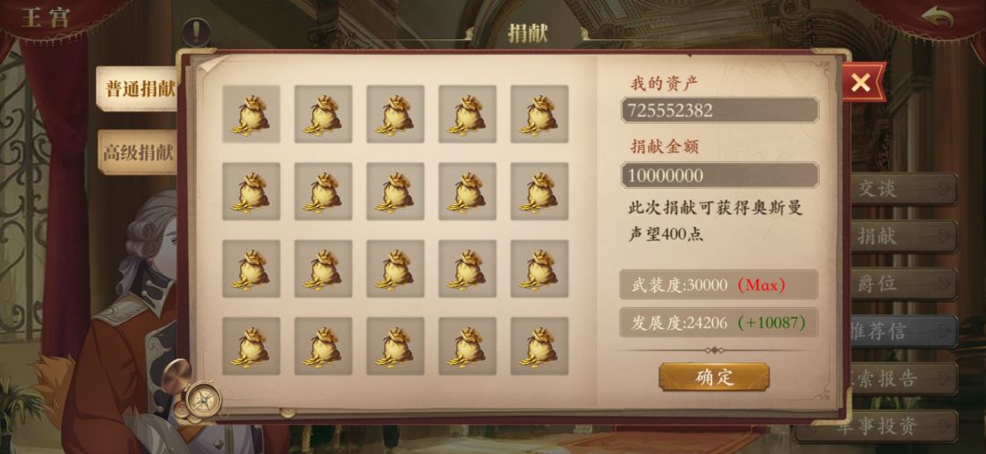 捐献可以一次捐一份,也可以一次性捐20份,分为普通和高级,简单来讲就是高级捐献单次投资花的💰比普通捐献单次投资花的💰更多,获得的该港口的武装度,发展度以及该港口所属国家的声望也比普通捐献获得的多,一次性普通捐20份金,还可以获得1份推荐信,高级捐献,一次性捐献20份金,可以获得10张推荐信