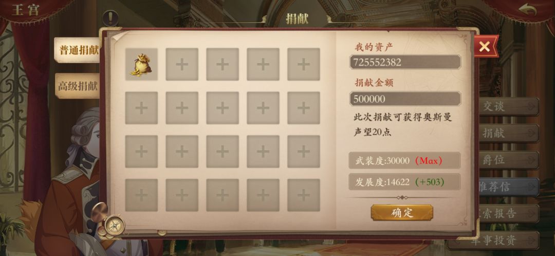 捐献:用于获得推荐信,提高该港口的武装度,发展度和获得该港口所属国家的声望值