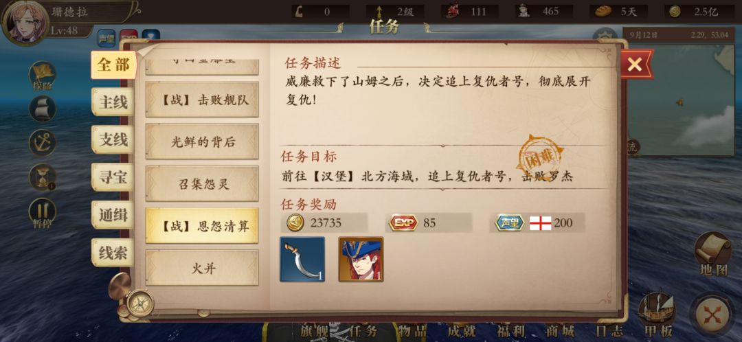 获得舰队信息后,查看地图,可以看到对方的船只,目的地信息,换好船,带满炮和水手,然后存档,无需宣战【因为如果想要彻底灭杀,宣战就是浪费时间】直接怼上去打他,如果不打不过回档,好汉不吃眼前亏,等实力够了再来打