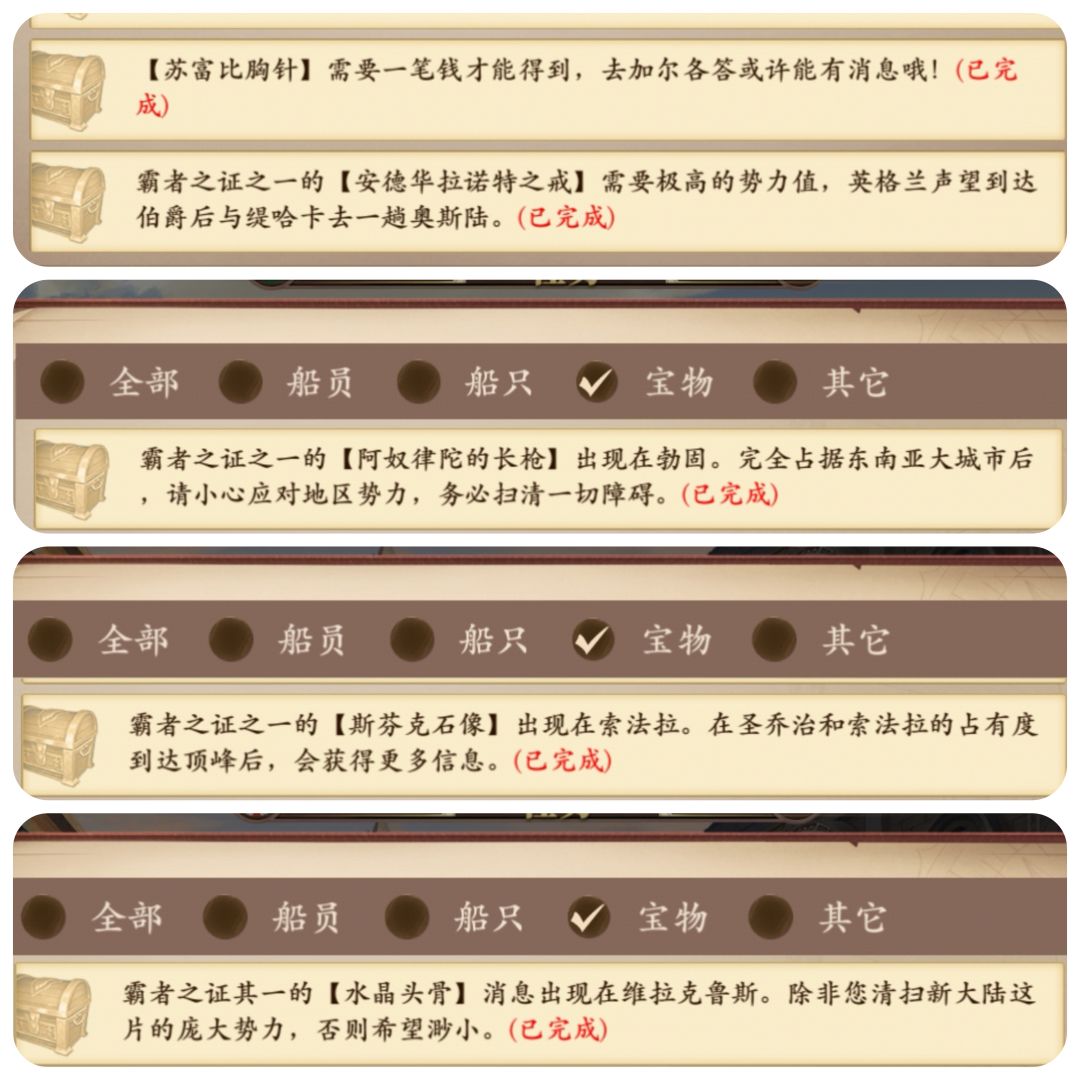 ☞7个霸者之证,阿奴律陀的长枪和水晶头盖骨需要自己手动装备,获取方式的前提是征服霸者之证所在的海域,7个集齐,也就是威压【占领】了全世界,霸者之证也是在酒馆喝酒获得的线索【看下两图】