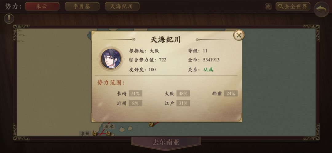 从属:你已经威压成功他,收他为小弟了,他的城市占有度,势力值,商品购买量都会算作你的,如果你的占有度+他的占有度正好是一个港口的100%占有度,也会算你独占城市,交易所货物你可以买到的货物也会增多【他的是你的,你的还是你的】【威压如何细致操作后面会讲】【威压后该势力每月给你上交孝敬钱,从计划中清除,无法攻击,交涉中只能亲善交涉,该npc好感度会随着时间推移降低,但永远不会背叛和反水】