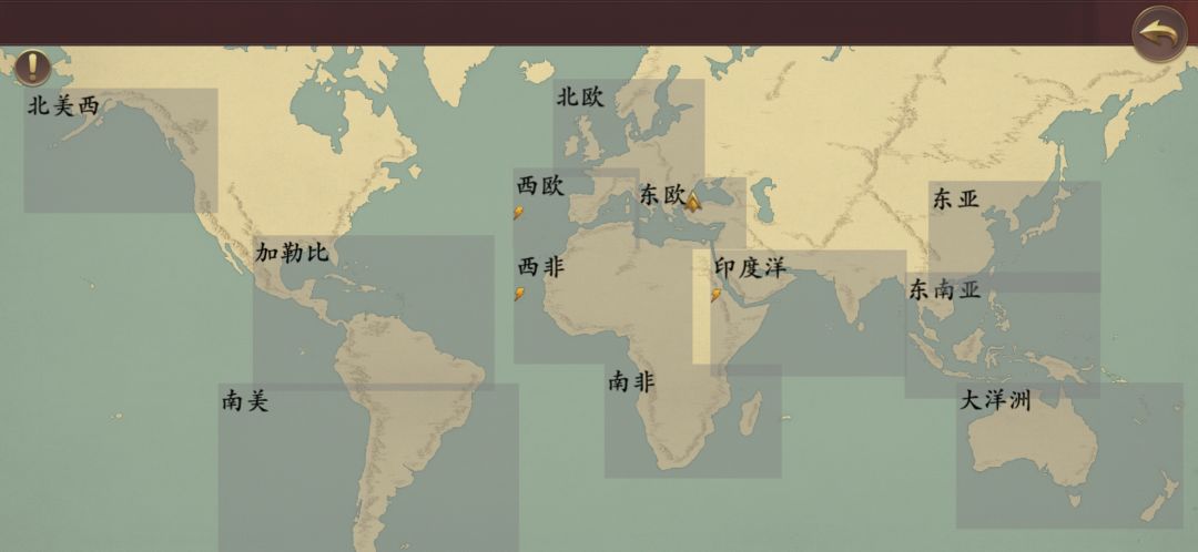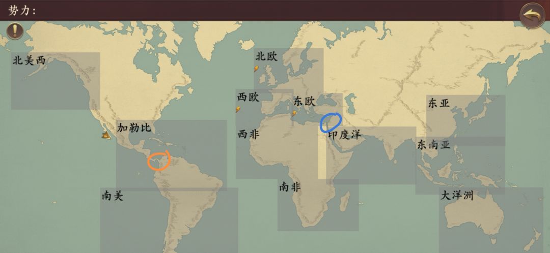 附上一个世界地图,地图中橙色圈和蓝色圈是运河,在地图上看不管是连通的还是不连通的,初始都是不连通的【需要完成任务才能开通,特别是橙色圈任务中战斗难度是危险或致命级别】【这里补充一下,该地图可以左右穿行,不能上下穿行,也就是说你可以从南美区域一路往左到达大洋洲】