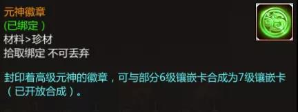 其中的元神徽章,可与部分6级镶嵌卡合成为7级镶嵌卡。