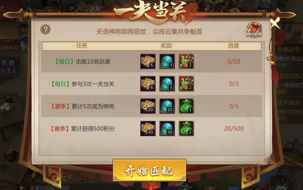 每当完成一局一夫当关后,在活动时间内将根据各玩家表现计算积分,活动结束时将依据活动总分发放豪华奖励,让你拿到手软!