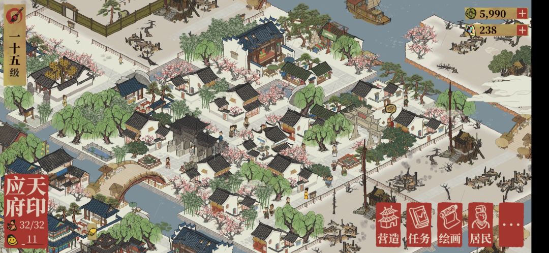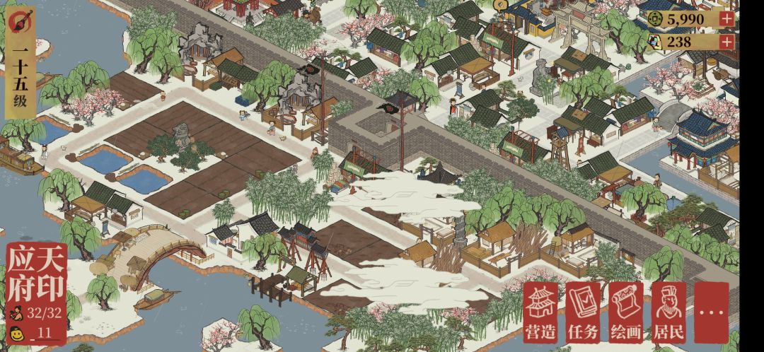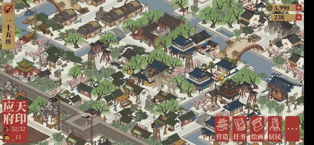 然后我觉得不足的,第一是到后期探索新土地需要的铜钱有点多,不知道是大家后期赚的钱很多的原因吗?反正我是一直钱很紧张。第二就是可以增加昼夜,这是我看帖子有个人提出来的,我觉得这个想法很不错啊,如果觉得晚上很黑,可以在装饰贴加路灯,在建筑上增加一到晚上就会亮的灯,秦淮河畔灯火阑珊,会非常漂亮。
