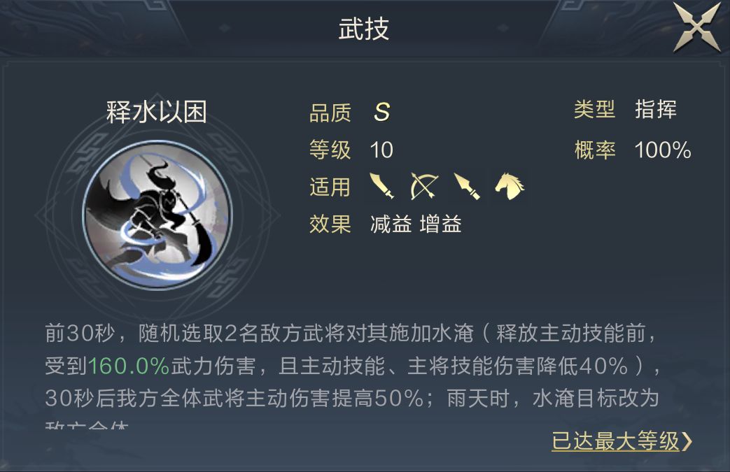 前30秒的水淹效果,在雨天频繁的新赛季中非常强势,面对主动队伍时,相当于在前30秒拥有2~3次全体160%伤害率的输出机会。并且该技能触发比敌方技能生效早,意味着敌人所造成的伤害永远比预期的要低(兵力与最终伤害相关),且该技能的伤害率能受增益影响,与刘备的昭烈、温酒斩将等技能都有不错联动。缺点是只受主动技能触发,在面对连击队伍或单核队伍时收益非常低。