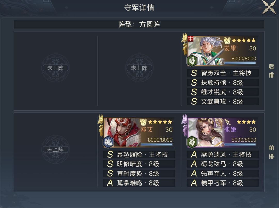 第一关邓艾的长时眩晕与姜维的自我续航,都对战斗时间有一定影响,不过张姬的坦度较低,使用双输出阵容走236站位,有很大机会在战斗时间结束前完成爆头。