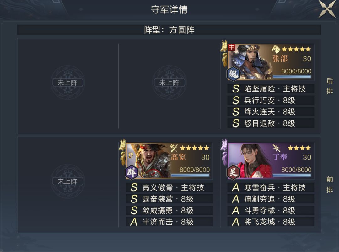 第二关守军同样拥有一定的控制能力,站位破绽也相同,可以利用起免疫缴械的赵云或是免疫沉默的SP赵云进行输出,其他连击将最好配置有避实击虚;我方站位与第一关相同。