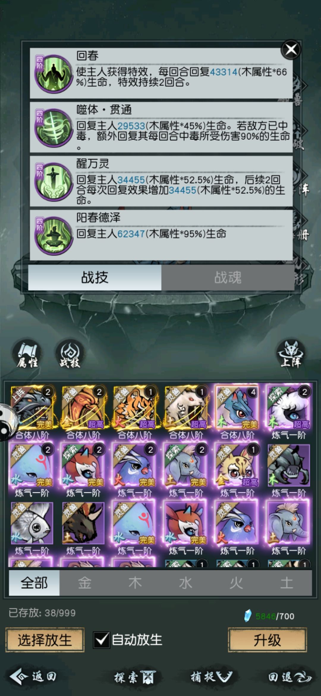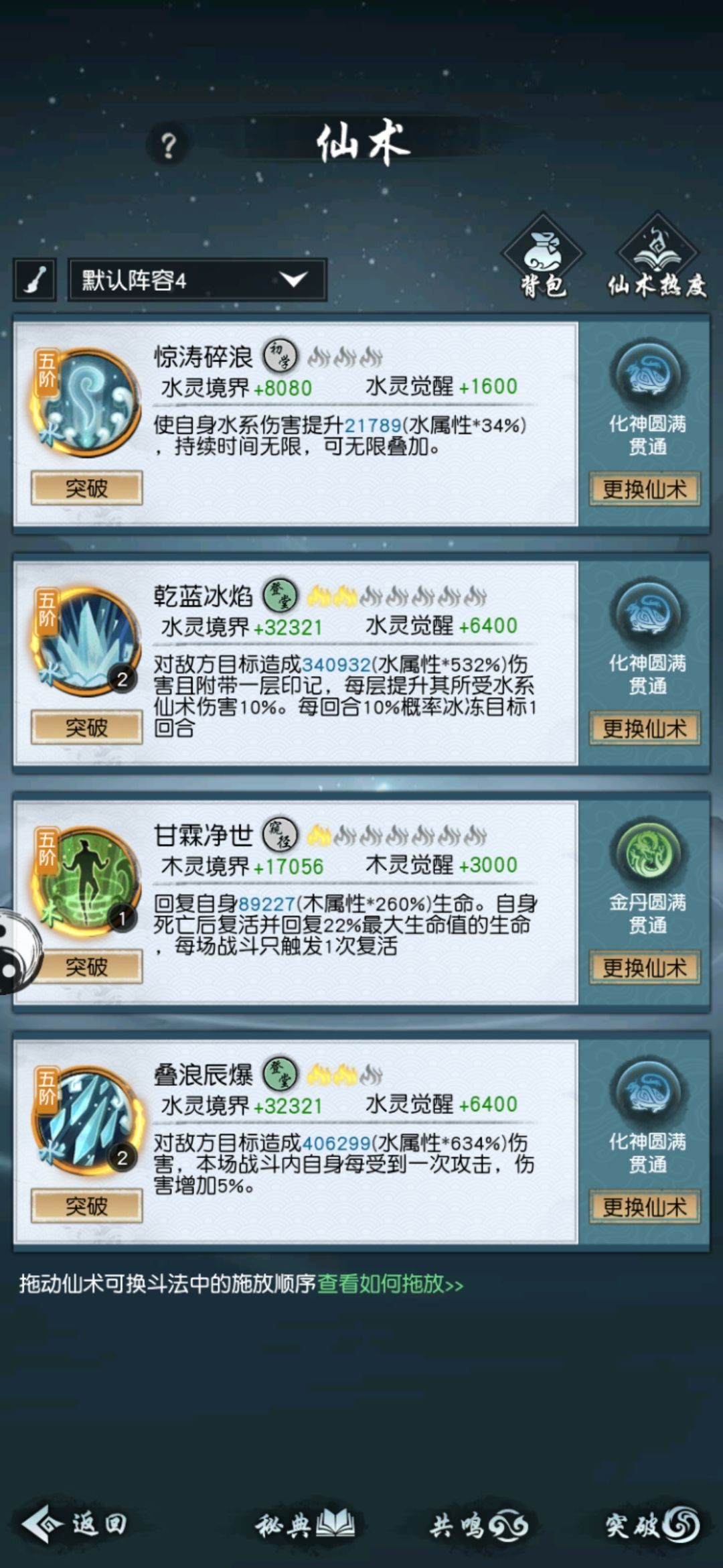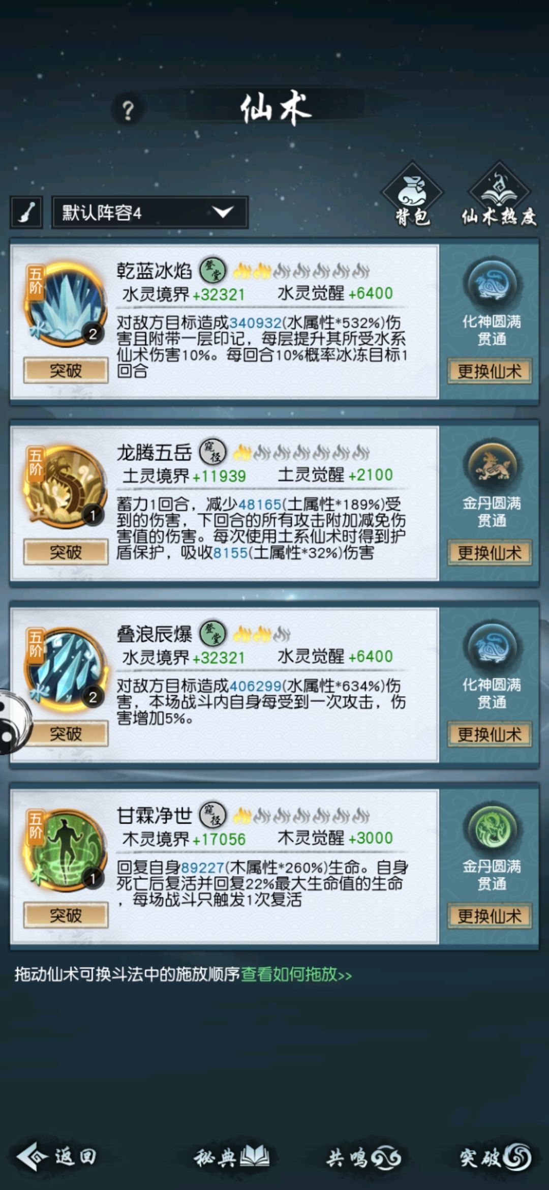 仙术始终是这四个(木高可换成借岳,这样的话灵宠带回血),顺序按情况调整,最后可以调整到复活后也就是最后一回合打出的是伤害性技能(有时候复活后放不出技能,应该是bug)。灵宠带回血或者护盾,如果灵宠伤害很暴力,也可选择带。
