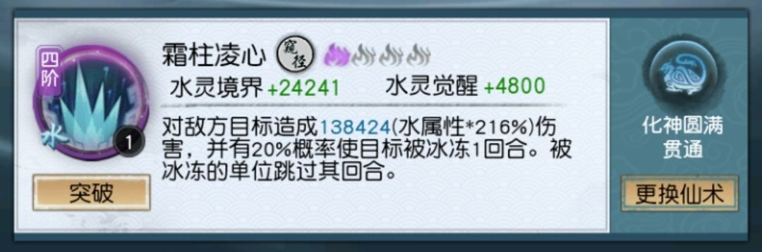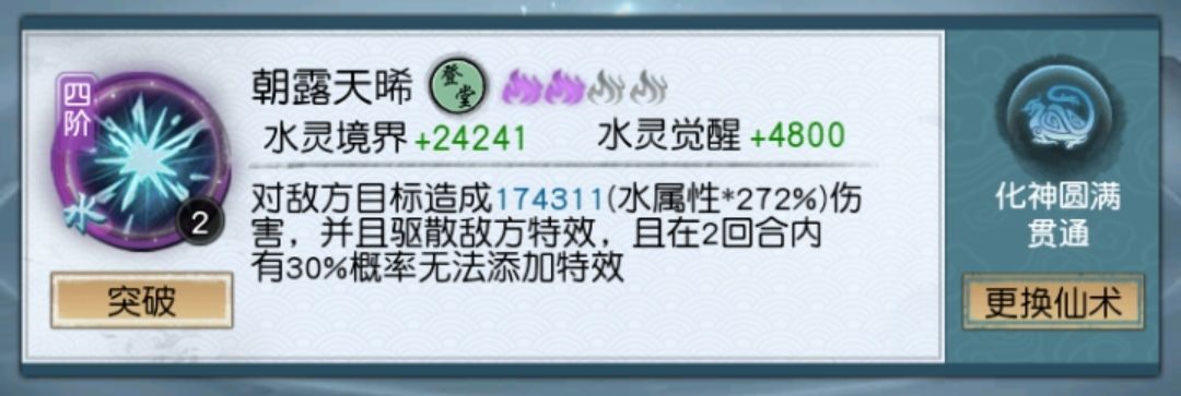 水系核心之一,心愿必抽,不会被驱散(不知道是不是bug),这里经实测直接下结论:效果大于锐锋霜冲(在当前版本驱散并不多环境下,战斗回合数少于30,甚至很难达到20的情况下),主角放了两次之后,效果就非常可观。