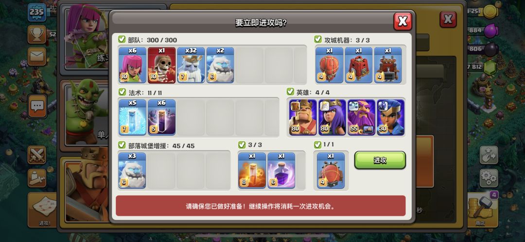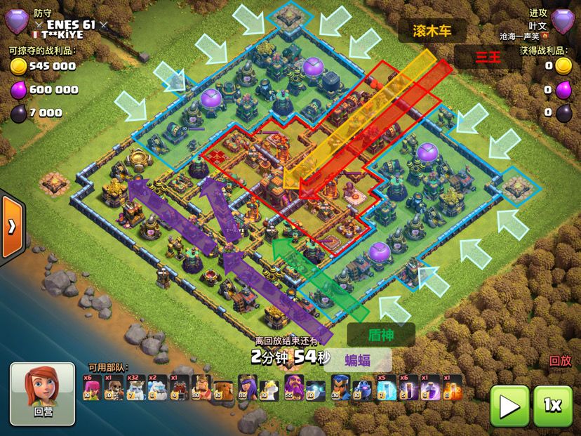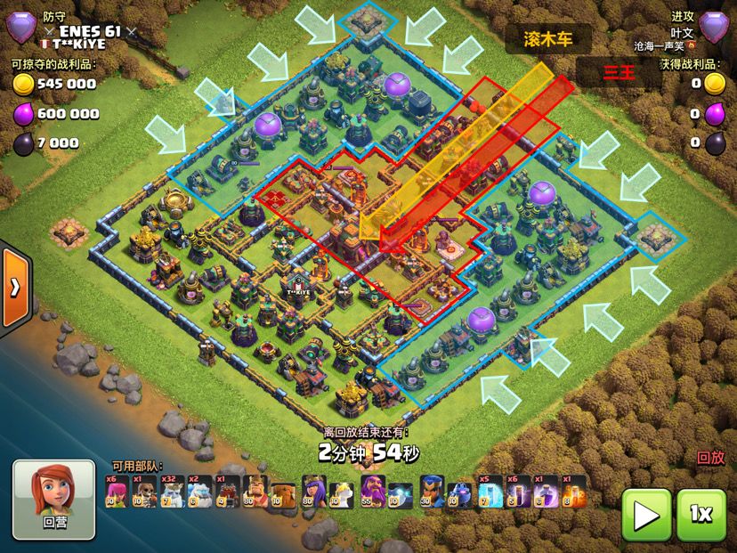例如上图,大本营在12点方向,所以我选择从6点方向突进,这样滚木车开墙的同时,还可以打到白鸟和多头,为避免三王走偏,我会用2个幽灵进行左右断边,同时还带了1个超炸开墙,确保三王进入城墙内。
