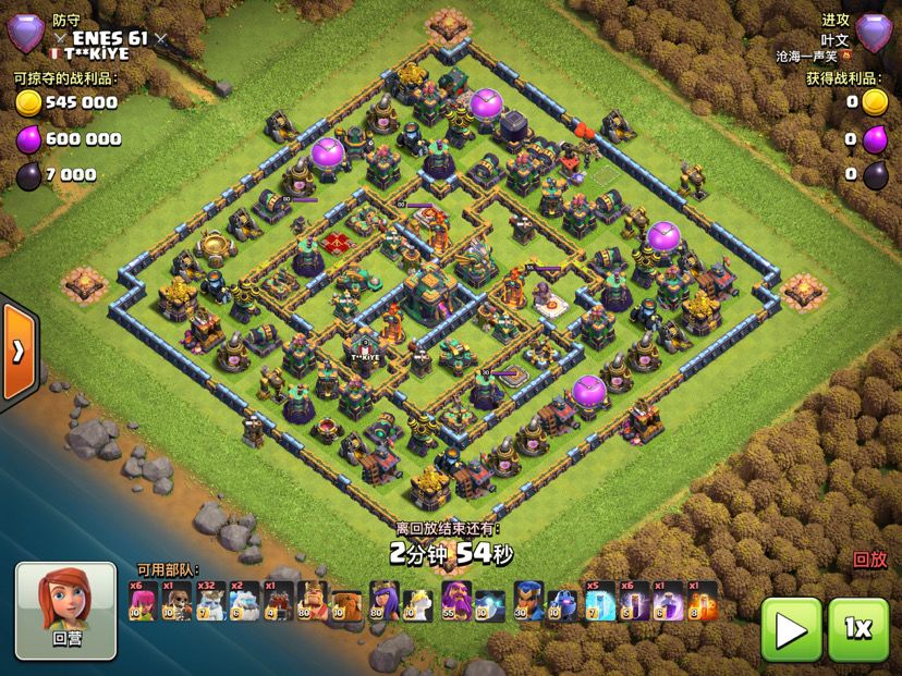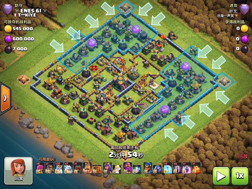 那为了防止三王不走偏,必须得把6点钟方向,以及4点钟方向给断了,而6点到9点这个方向的防御建筑又比较多,我何不就从C边平铺大部分幽灵呢,把这一片的防御给清了,三王突进时就不用承受那么多火力了嘛,只留少量幽灵4点方向断边就好了,于是得到了以下的进攻视频。