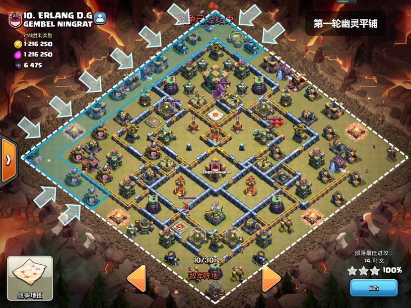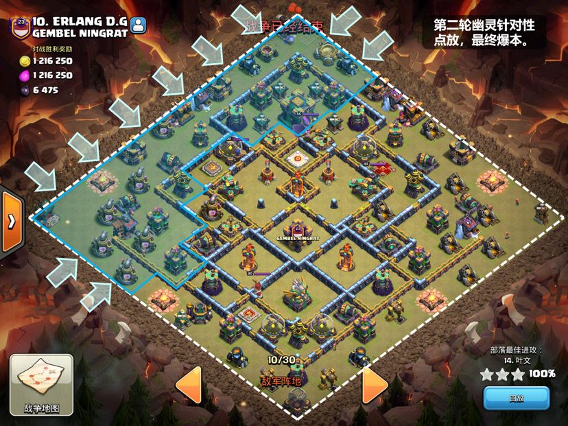 我其实也尝试过这么打,但效果不理想,14本的毒太疼了,还减速,爆本后,三王要扛着大本营的毒继续输出,等毒消失后,三王也差不多没了,只清理了少量的建筑,划不来,爆本这活交给幽灵就好了。