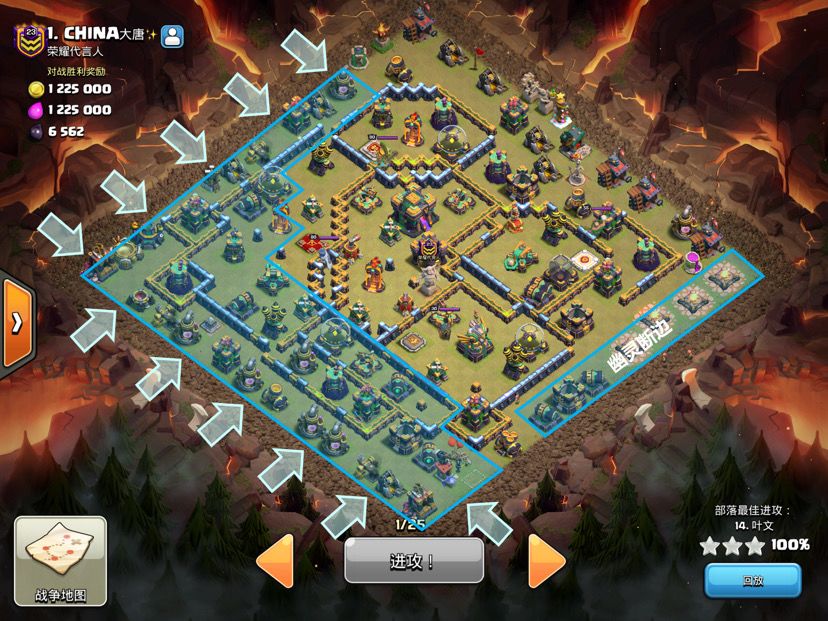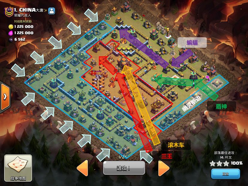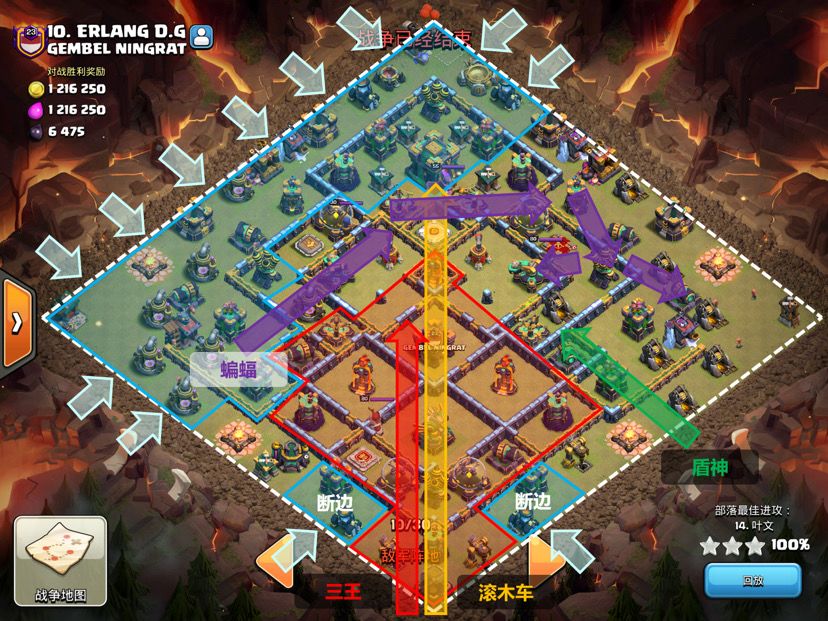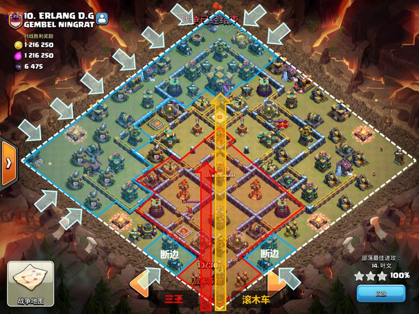 爆本后,冰人、三王、战车从大本远端突进,配合狂暴、无敌,可长驱直入,把中间一片都给清了。
