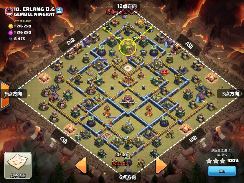 详细说,我们先观察大本营的位置,这决定幽灵平铺的方向,例如上图这个阵,大本营靠近12点方向,它离AD两条边的距离都一样,所以AD两边都可以进攻。