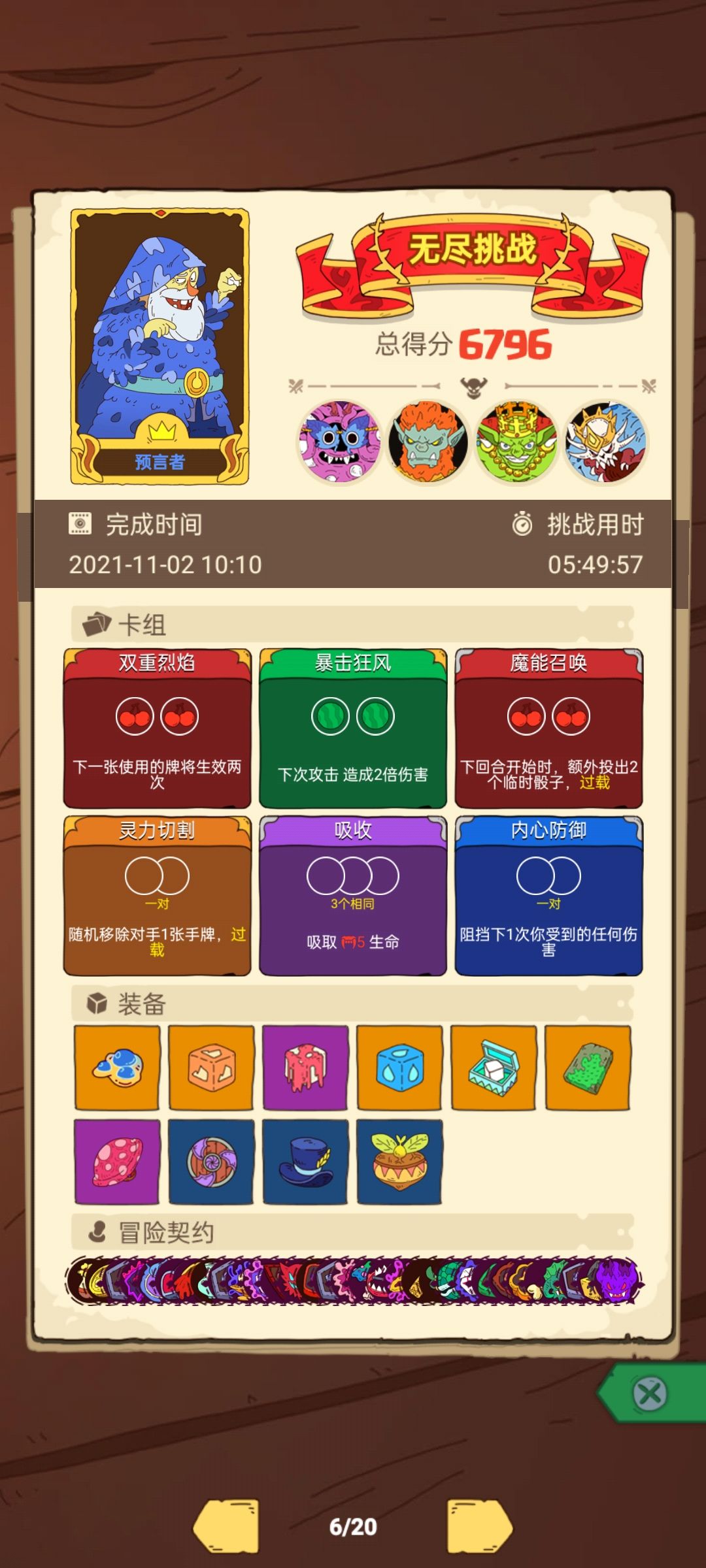 核心装备:所有的能免除伤害,降低伤害的装备(只要第一轮的,看我那几个蓝装就行。),还有能提供不死buff的装备(萝卜),以及增加骰子的装备。