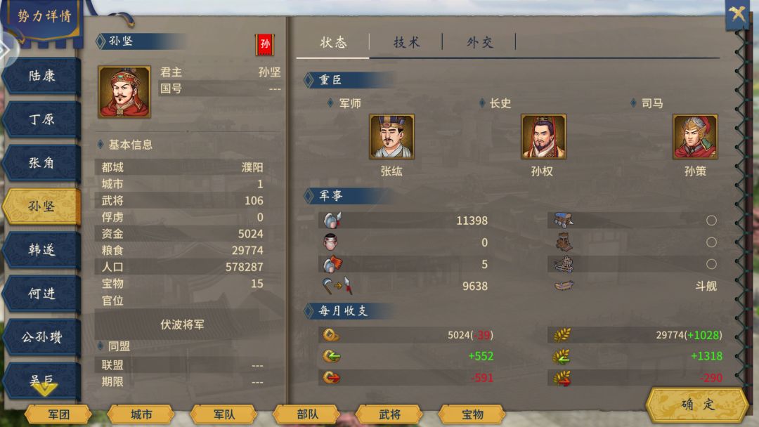 买通了丁原势力,但感觉这盟友的位置只适合当短期盟友,作用大概是我打公孙瓒他能让个路,打何进张角时能小帮一把手,后面他的兵就出不到其他势力了
