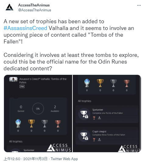 近日,Access The Animus发推表示,《刺客信条:英灵殿》更新了一个名为“Tombs of the Fallen”(堕落之墓)的奖杯列表。这个列表里有两个成就奖杯,玩家完成一个堕落之墓可以获得“洞穴探险者”奖杯,完成三个可以获得“地穴专家”奖杯。这很有可能与《刺客信条:英灵殿》即将到来的更新内容有关。