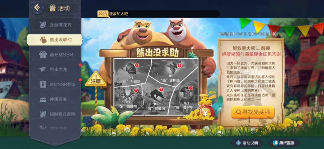 2.通过【熊出没求助】活动获得光头强坐骑,装备并首次召唤;