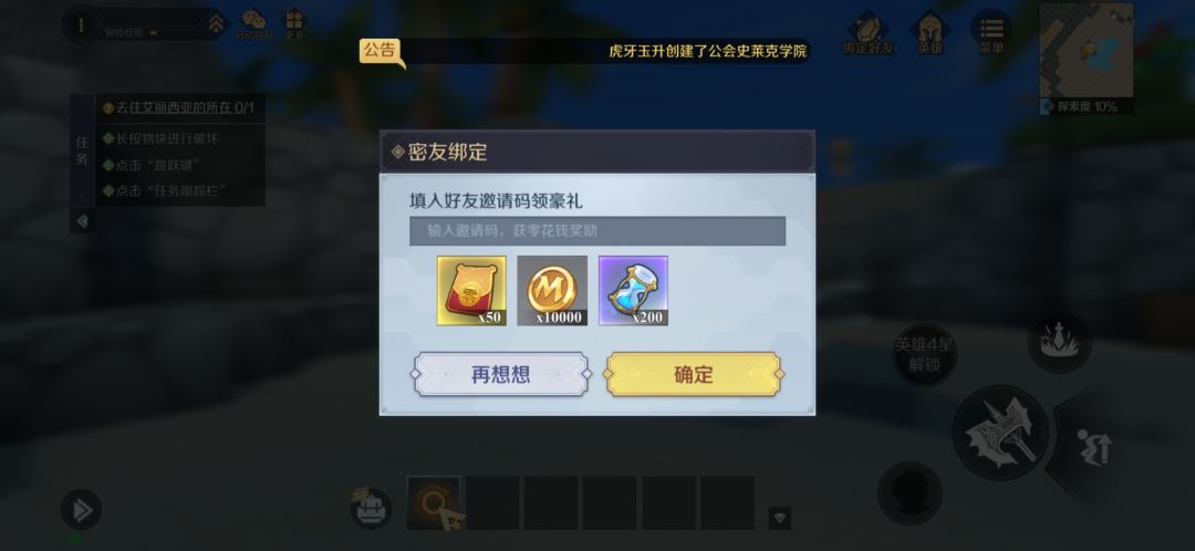 好友获取你的邀请码后,下载游戏并安装进入新手教程,在【正式取名创角】之前,在游戏内对应绑定入口输入邀请码,即可成为你的绑定好友(每位好友仅能成为一名玩家的绑定好友);完成取名之后,无论是否使用了好友的邀请码,绑定入口将不再对外展示