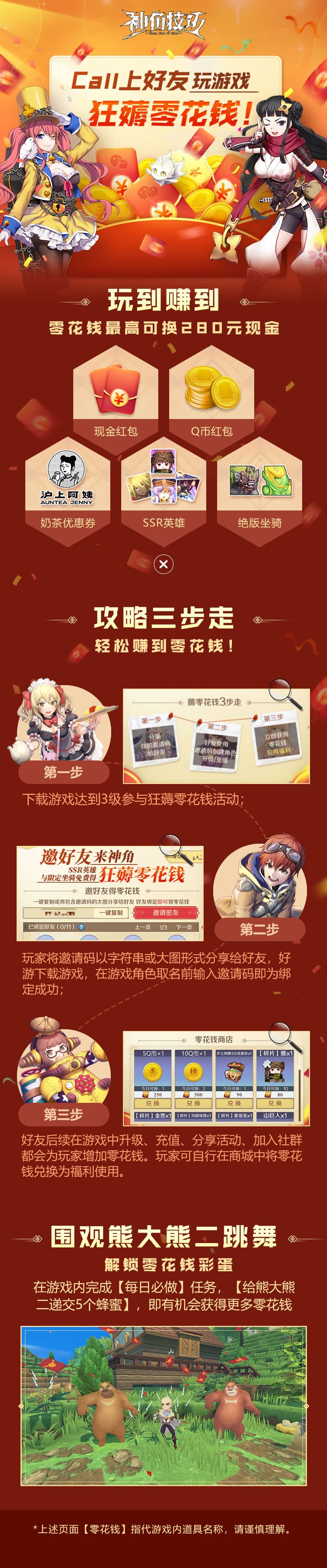 参与游戏内【狂薅零花钱】活动,分享邀请码成功邀请好友,即可得高价值奖励(最高280元现金)。