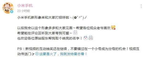 小米表示,以后小米手机会以全新拟人化形象与大家多多见面,希望用户为这个新形象取个响亮的名字。在评论区里,有人建议叫“米游姬”“米多多”“小米花”,还有人叫嚷称“米哈游”得了。