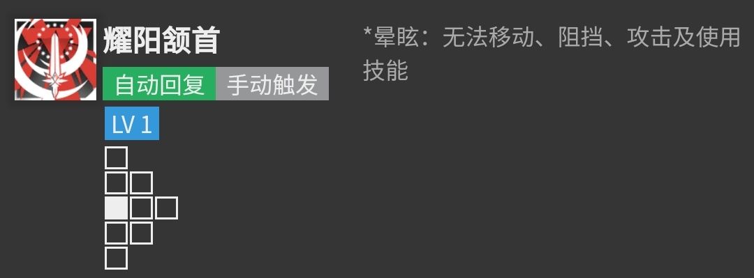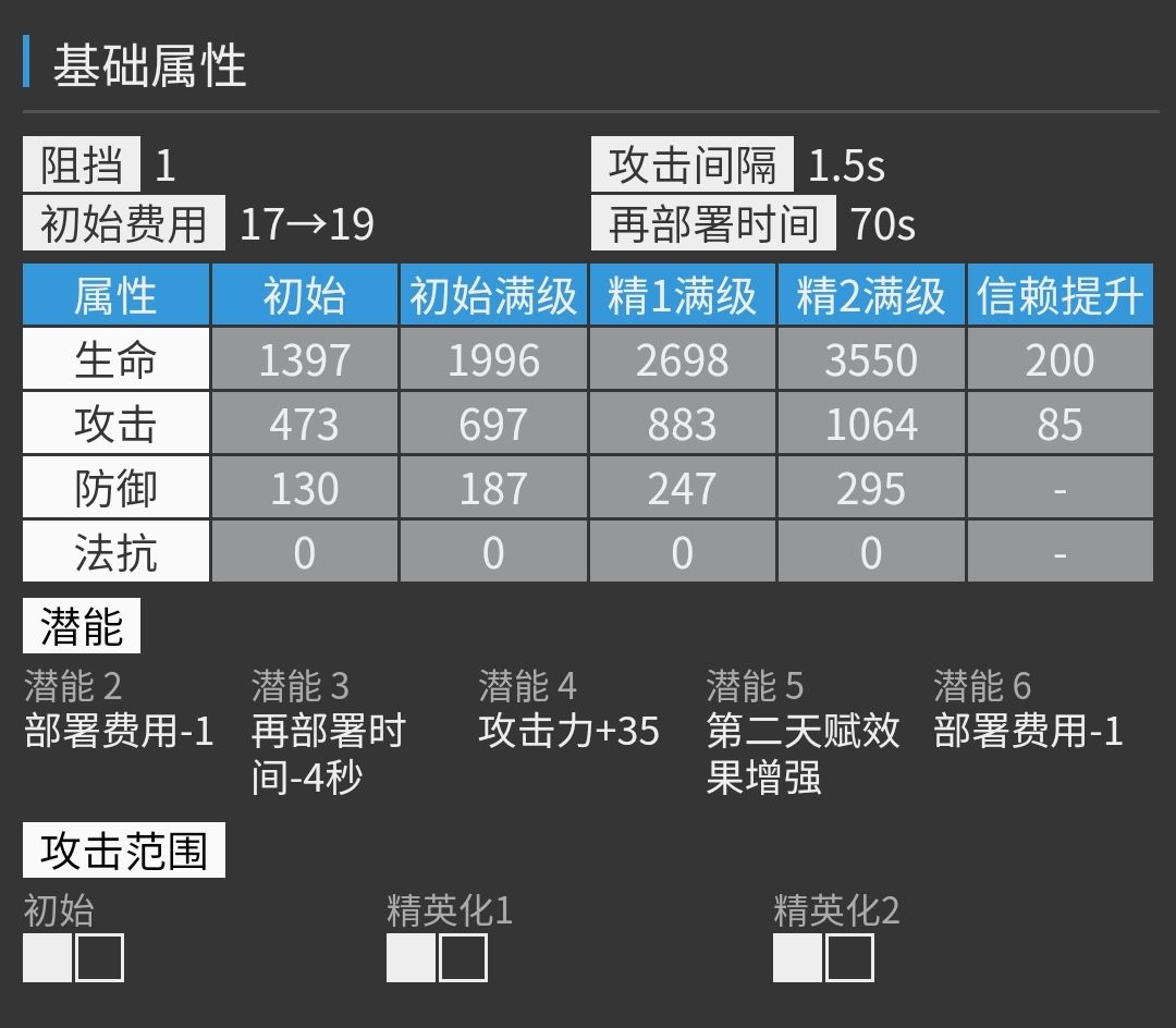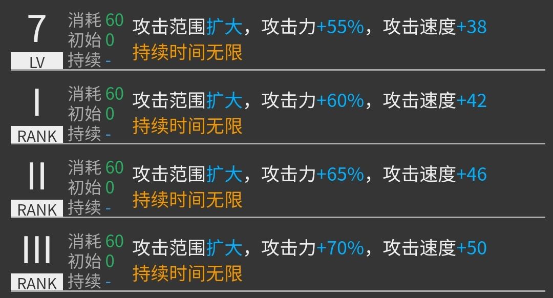 永续类技能,类似煌2技能。暖机时间较中等,暖机完毕后攻击力约为1953,攻速间隔约为1.1s。提升较为可观,常态输出较高,但不适合作为基石干员使用,可用利用增加的攻击范围再盾侧盾后补充输出。