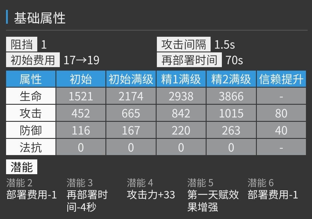 决战型技能,输出十分可观。开启技能后攻击力约为2757,防御力590。吃满可造成约4.4万真实伤害。(凯尔希三技能3.4w真伤)初动和回转也较优秀。