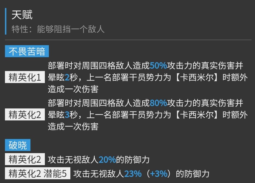 简单粗暴的无视敌方单位20%防御,有效提高临光破甲线,护甲越高收益越大。临光即使面对千防大怪也能造成可观的输出。真伤无法吃到此天赋的增益。