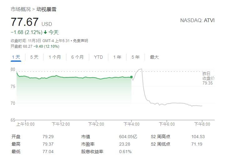 今天(11月3号)凌晨,暴雪公布了公司2021财年的第三季度财报,虽然Q3整体净利润上升6%左右,但股价已经暴跌10%,最低点69.75美元/每股,达2021年最低。