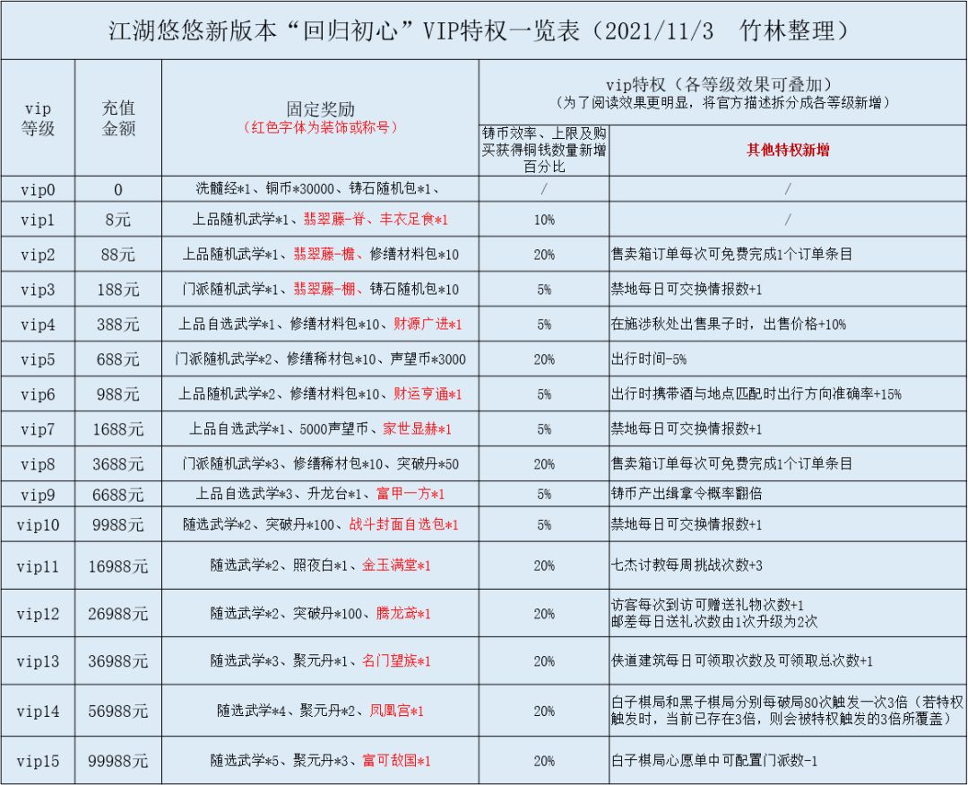 【竹林】江湖悠悠新版本“回归初心”VIP特权一览表