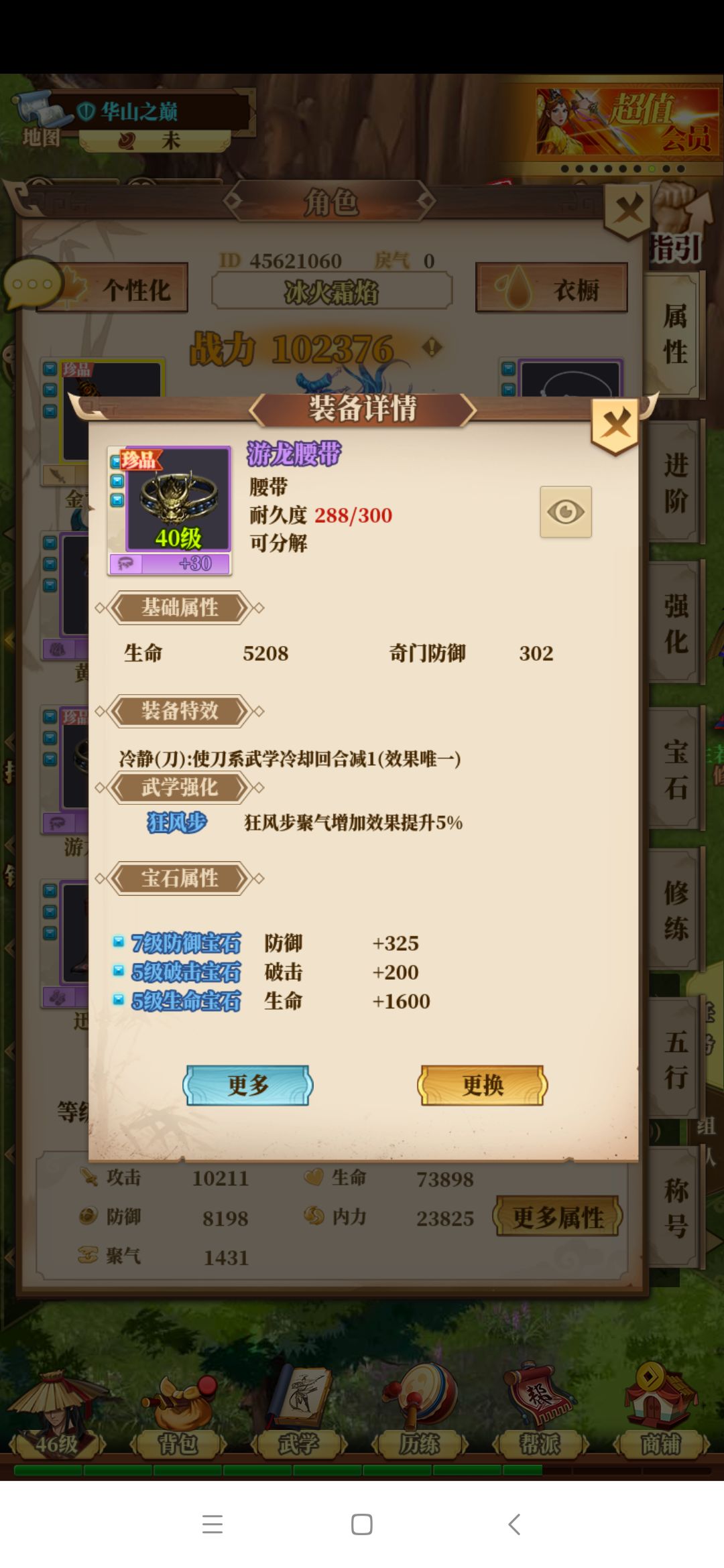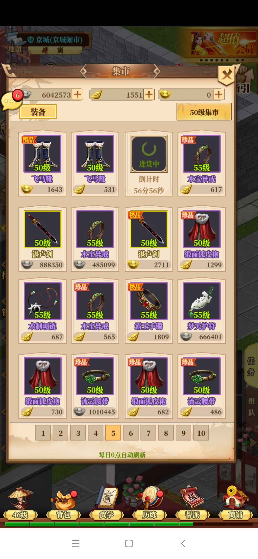,发现一个珍品刀,特效刚好是减5级(45级可以用),附加属性有三条,攻击、耍刀还有个啥忘记了,属于极品装备了,我看了下自己的武器,如果换上攻击可以加1000左右,耍刀也可以加个几百,不过当时那把刀有点贵,300万银子,所以我犹豫了一下,准备先看看后边的装备再说,结果再切换回来那把刀已经被别人买走了
