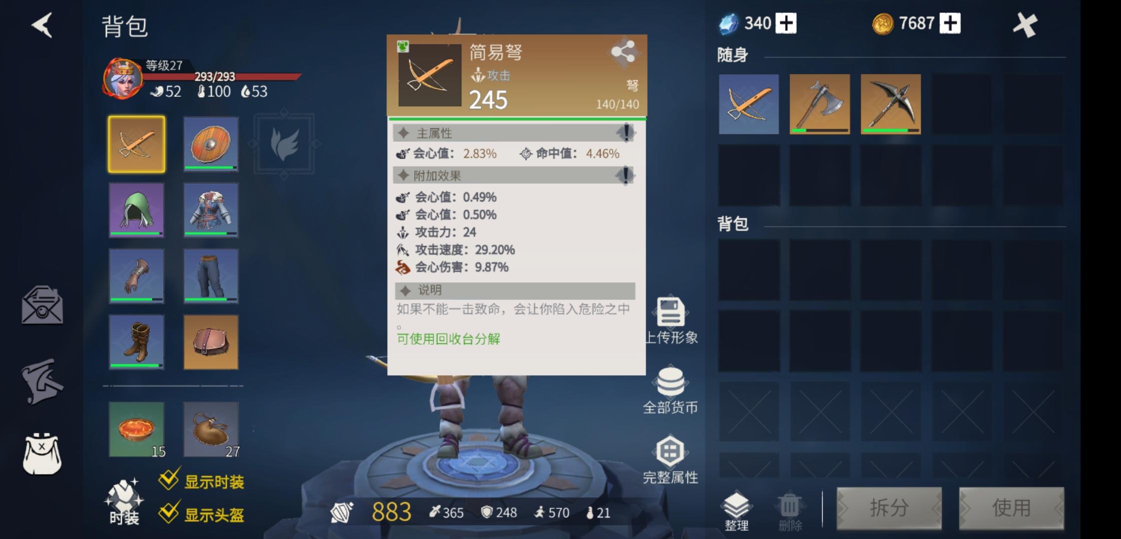 3,战斗系统:这个游戏是2.5D视角,存在一些看似躲过了但却判定命中的情况,低难度的图被打几下可能都是-1,-1血,但是到了某些地图可能小怪打一下就是200+的伤害,死亡前几次还可消耗水晶复活,如果是金币的话貌似是每次复活金币费用逐渐增加到1100金币。我是比较喜欢用弓箭风筝小怪的,但是这个游戏弓箭的射速和攻击动画实在是令人难受,做了一个金弩出来舍不得用,因为大概去低语之森打一遍就会爆掉,不能维修也不能转移附加属性。即使花了大量材料打出了一身满意的装备,可能用不到两天就会废掉,实在是心痛。